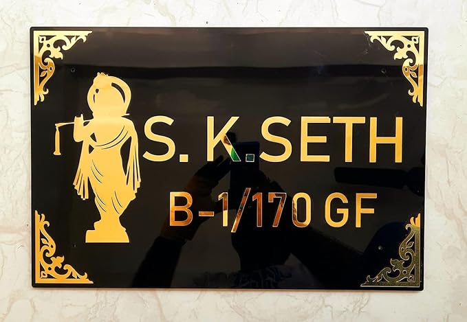 KaaHego Customized Acrylic Krishna Name Plate for Home Entrance | Black & Gold Personalised Door Name Board with House Number | Premium Designer Flat & Apartment Name Sign