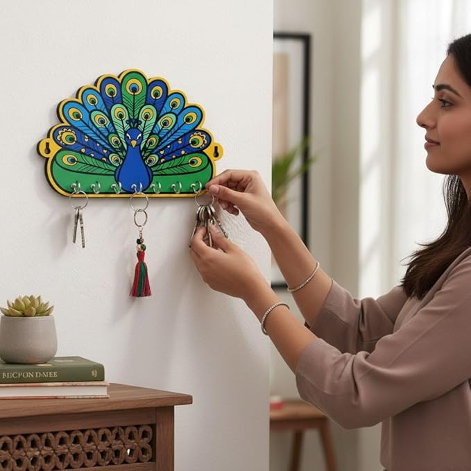 Be the first to review “KaaHego Holder for Home Decor Stylish | Key Hangers for Wall | Wooden Key Stand for Wall (7 Hooks, Peacock)”