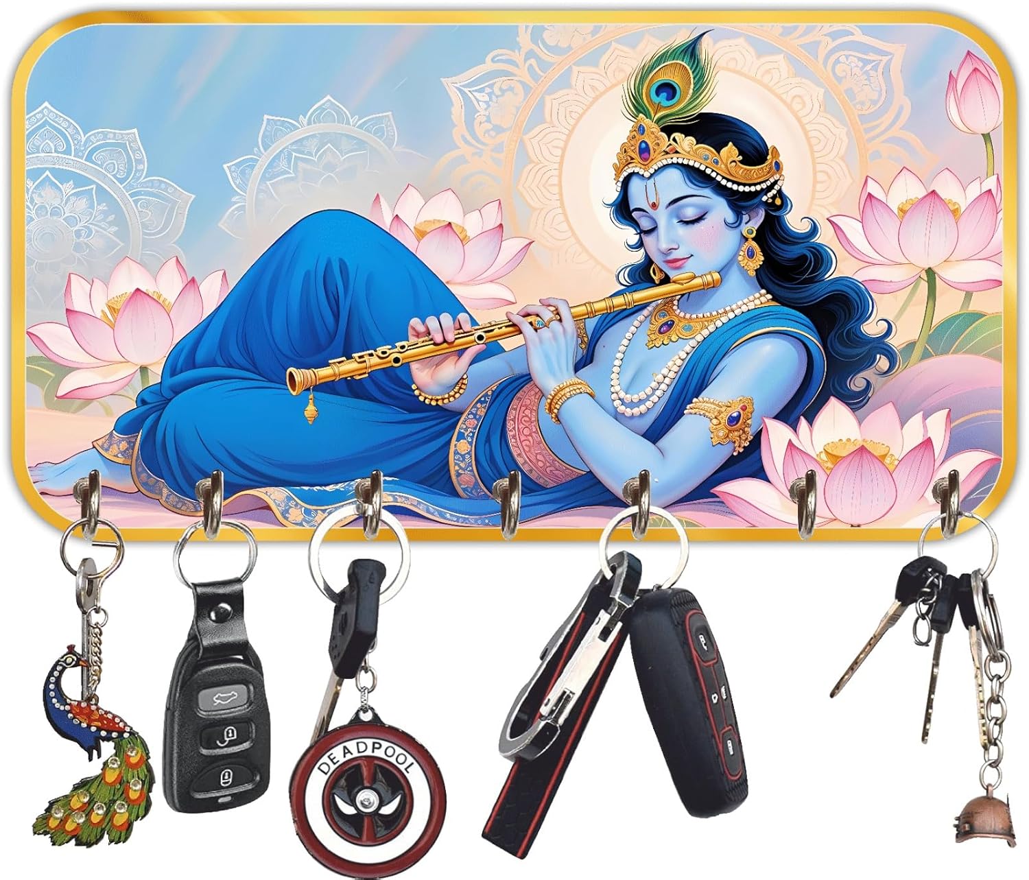 KaaHego Radha Krishna Wooden Wall Mount Key Holder, Rectangular, 8 Hooks, Multi-Colour, Modern Style, 25.7 x 12.7 cm
